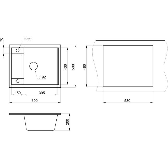 Кухонная мойка кварцевая Granula GR-6002 односекционная квадратная с крылом, врезная, чаша 395x430, цвет шварц (6002sv)