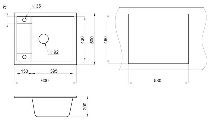 Кухонная мойка кварцевая Granula GR-6002 односекционная квадратная с крылом, врезная, чаша 395x430, цвет шварц (6002sv)