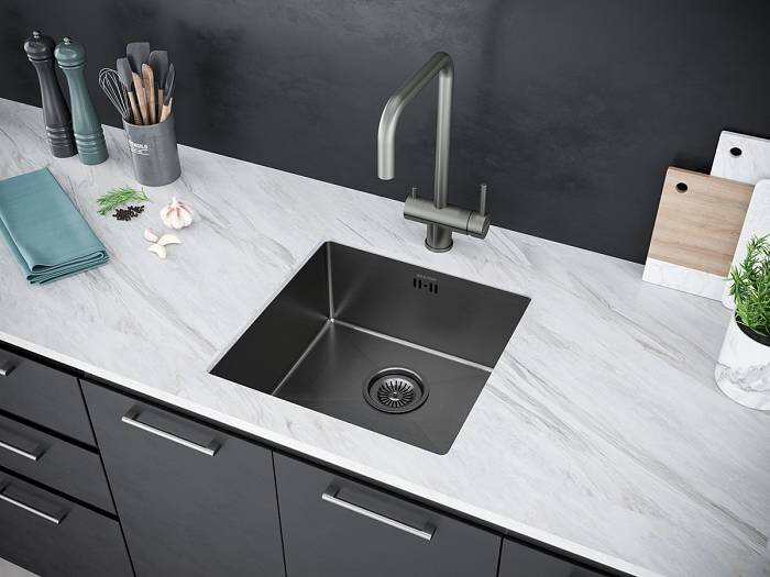 Мойка для кухни из нержавеющей стали Paulmark KRONER 45 450х510 мм, PVD покрытие, отверстие под смеситель, врезная, подстольная и вровень со столешницей, цвет вороненая сталь
