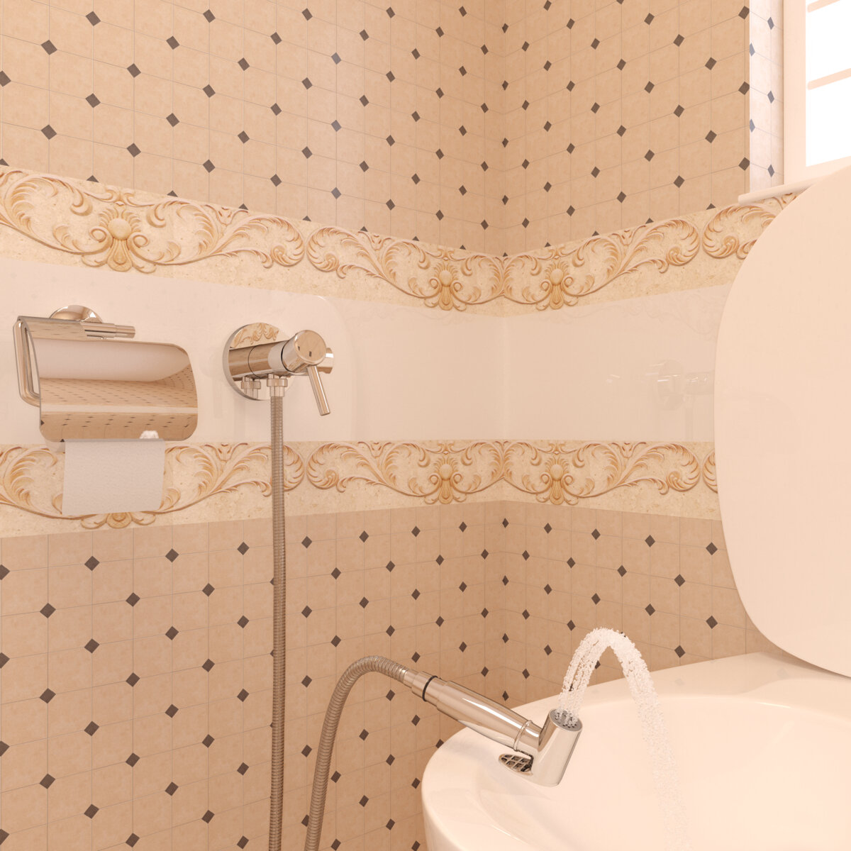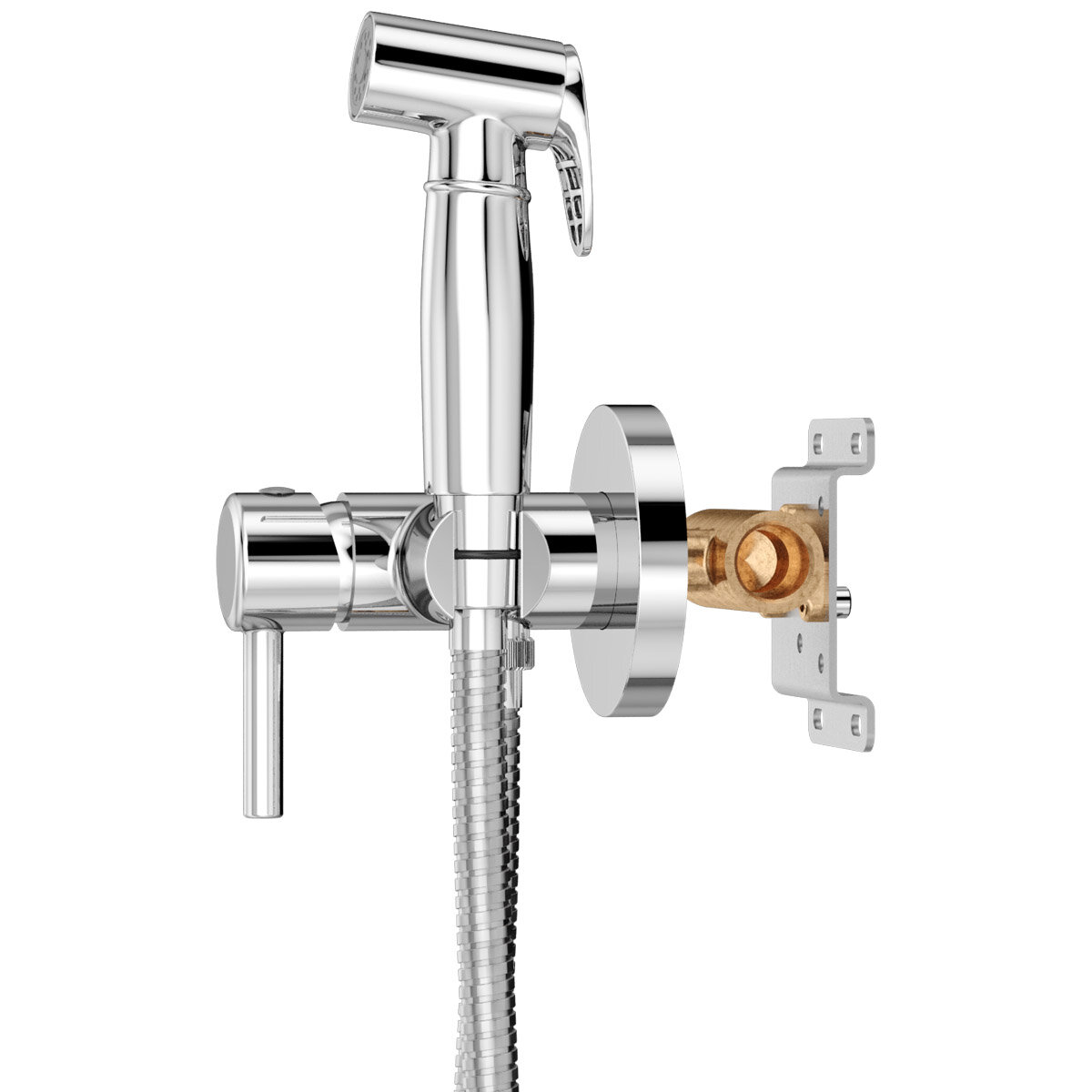 | Комплектация | Смеситель 25 мм встраиваемый, панель декоративная круглая, рукоять управления, гигиенический душ (пластик), шланг металлический 100 см |