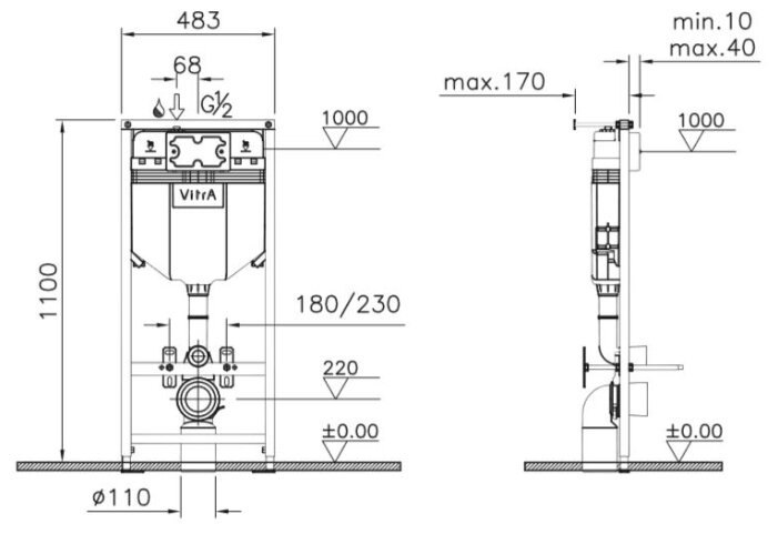 Инсталляция с унитазом Vitra S10 сиденье микролифт клавиша матовый хром 9842B003-7206
