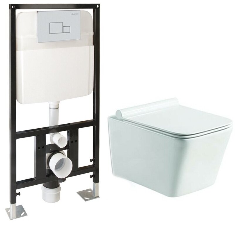 Унитаз подвесной с инсталляцией SantiLine SL-5007+SL-01 безободковый с сиденьем и клавишей смыва хром