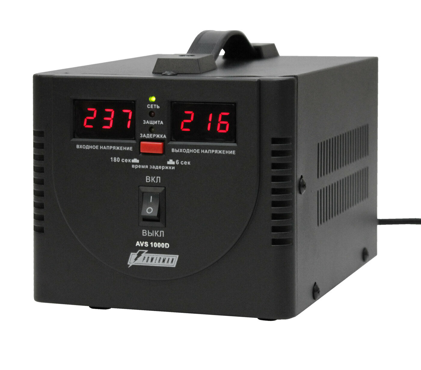 Стабилизатор POWERMAN AVS 1000D, черный, ступенчатый регулятор, цифровые индикаторы уровней напряжения, 1000ВА, 140-260В, максимальный входной ток 7А, 2 евророзетки, IP-20, напольный, 200мм х 150мм х 140мм, 2,3 кг./ Stabilizer POWERMAN AVS 1000D, black, s