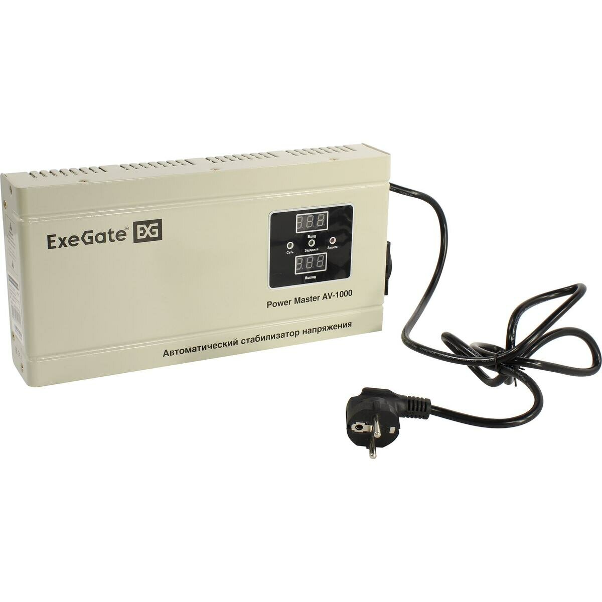 Стабилизатор напряжения настенный ExeGate Master AV-1000 (1000ВА, 140-260В, цифр. индикация вход/вых. напряжения, 5 уровней защиты, задержка, метал.корпус, евророзетка, RTL)