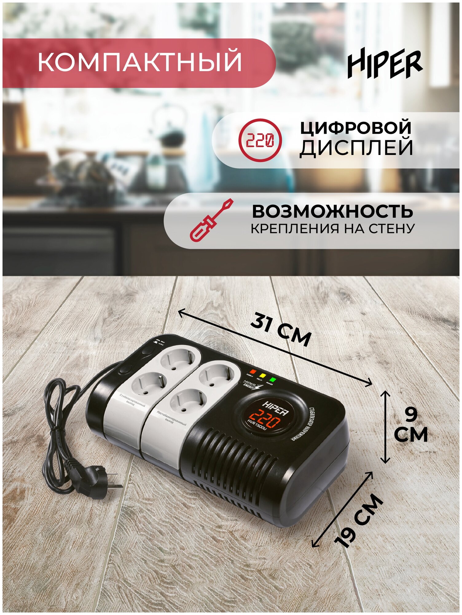 Стабилизатор напряжения HIPER HVR1500U релейного типа, универсальный, 1500ВА, диапазон от 125В до 270В, 750Вт, 4 евророзетки