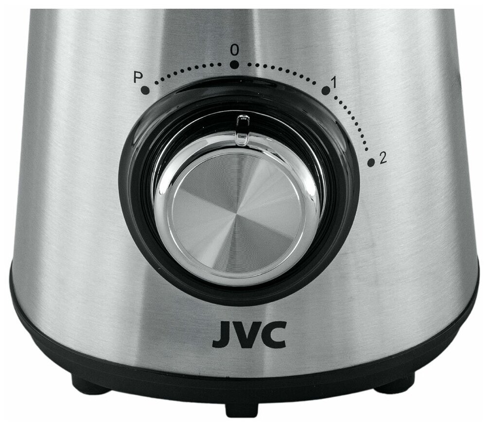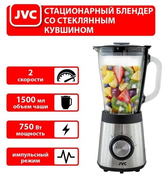 Блендер стационарный JVC в хромированном корпусе, импульсный режим, 2 скорости, стеклянный кувшин 1.5 литра, ножи из нержавеющей стали, 750 Вт