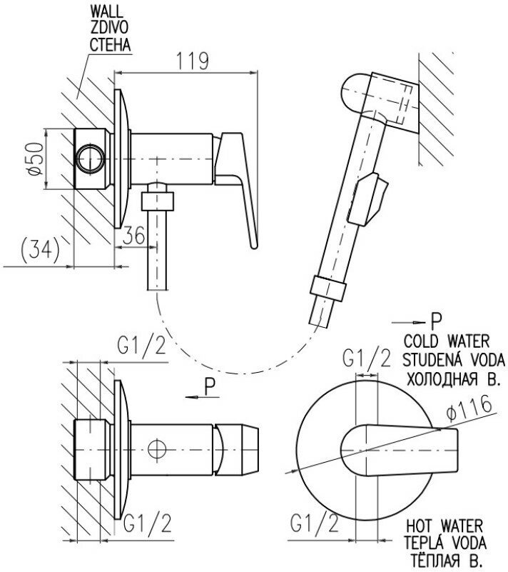 Смеситель RAV Slezаk Colorado для биде, включая тело скрытого монтажа, держатель метал., душевой лейкой с нажимным механизмом пласт.