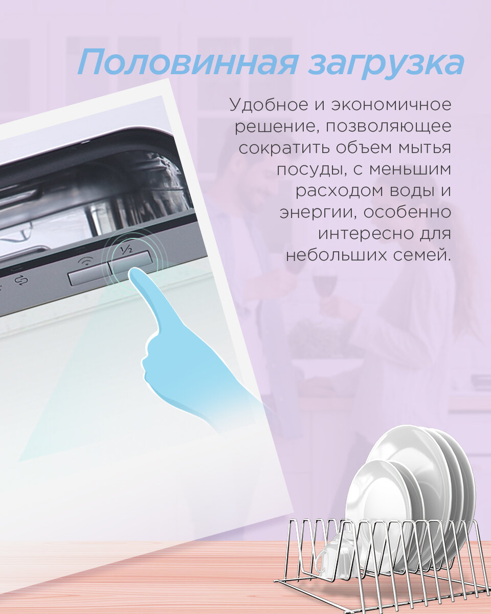 | Особенности конструкции | использование средств 3 в 1 / регулируемая по высоте корзина для посуды / таймер отсрочки |