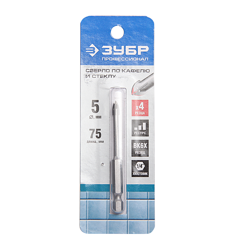 ЗУБР Ø 5 мм, 4-х резцовый, длина 75 мм, шестигранный хвостовик, сверло по стеклу и кафелю 29845-05 Профессионал