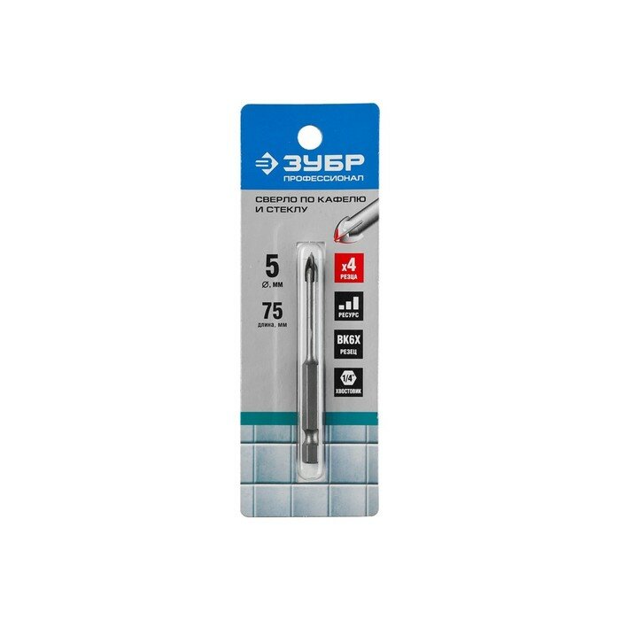 Зубр Сверло по кафелю, керамике, стеклу, с четырьмя режущими лезвиями, шестигранный хвостовик, 5 мм, "профессионал" 29845-05 29845-05 z01