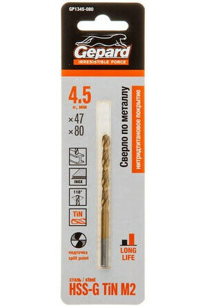 Сверло по металлу спиральное 4.5х47х80 мм GEPARD HSS TIN (GP1345-080)