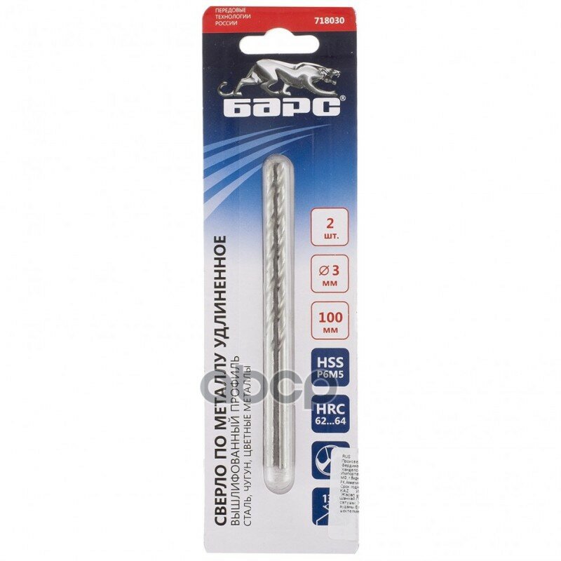 Барс Сверло спиральное по металлу, 3 х 100 мм, Р6М5, удлиненное, 2 шт Барс, ( 718030 )
