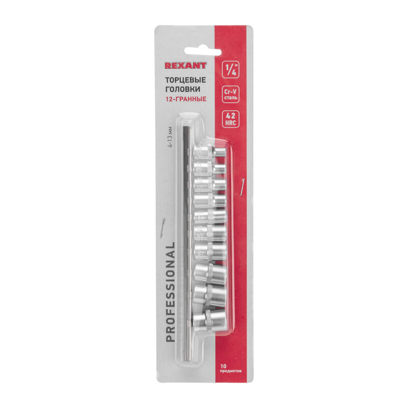 Набор универсальных торцевых головок REXANT 1/4, двенадцатигранные, CrV, 10 шт., 4-13 мм