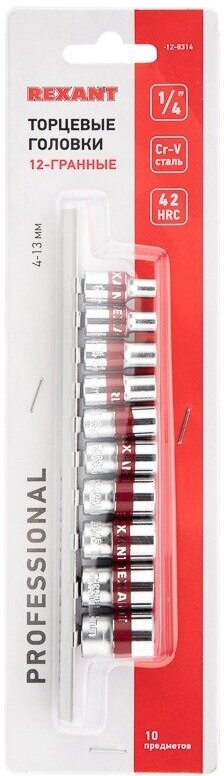 Набор универсальных торцевых головок REXANT 1/4, двенадцатигранные, CrV, 10 шт, 4-13 мм