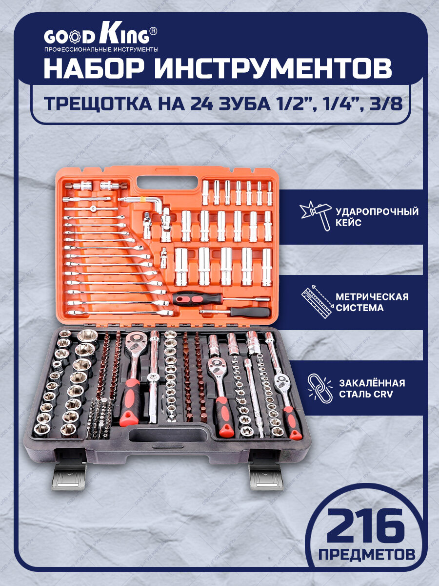 Набор инструментов GOODKING, 216 штук, трещотка 1/2", 1/4", 3/8", универсальный, для дома, для автомобиля (K-10216)