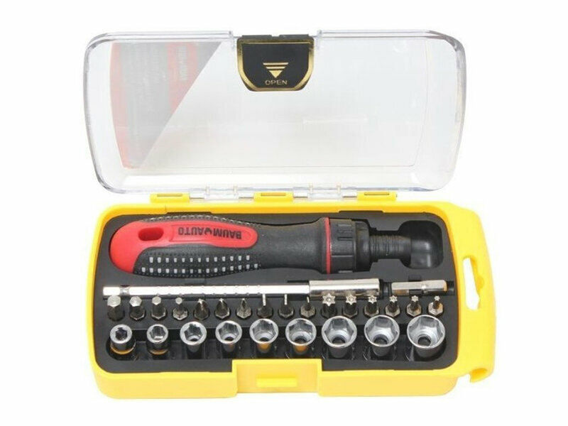 BaumAuto Отвертка реверсивная телескопическая с комплектом бит и головк (28пр.) в пластиковом футляре. BaumAuto BM-30314228