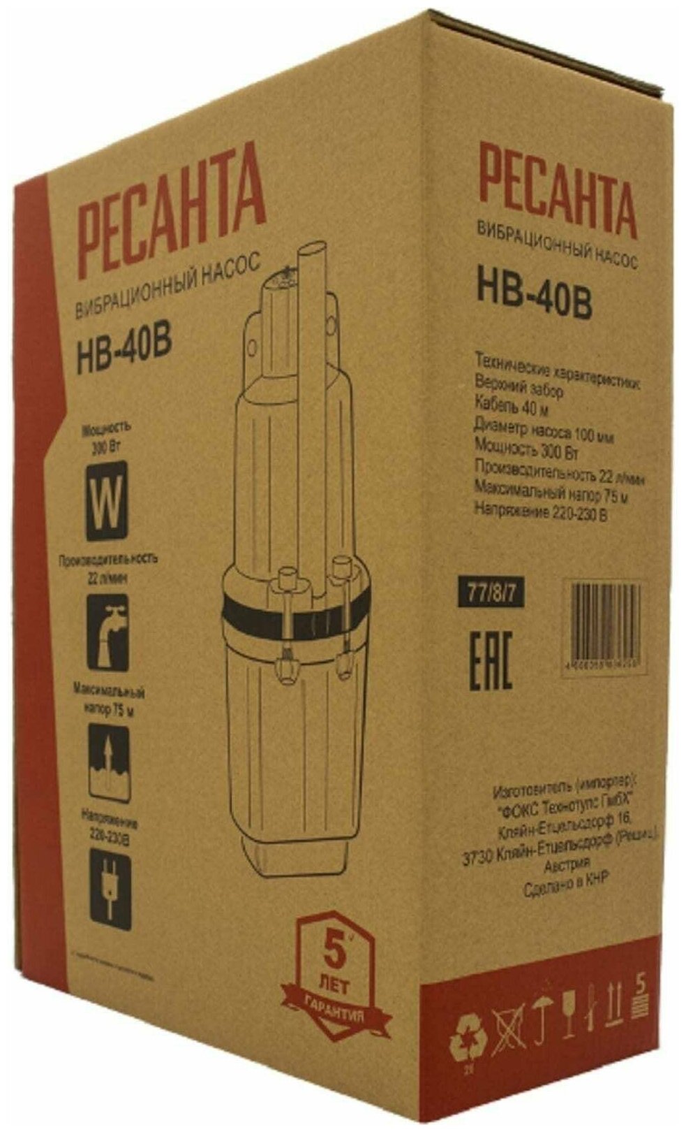 Насос вибрационный Ресанта НВ-40В 300Вт 1320л/час (77/8/7)