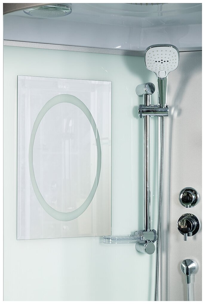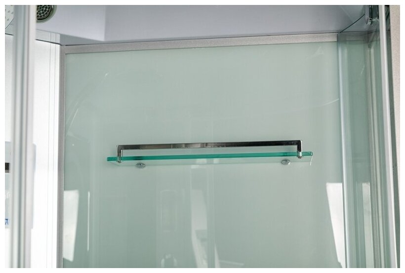 | Плюсы: | Тропический душ, подголовник, полки, поддон-ванная. |