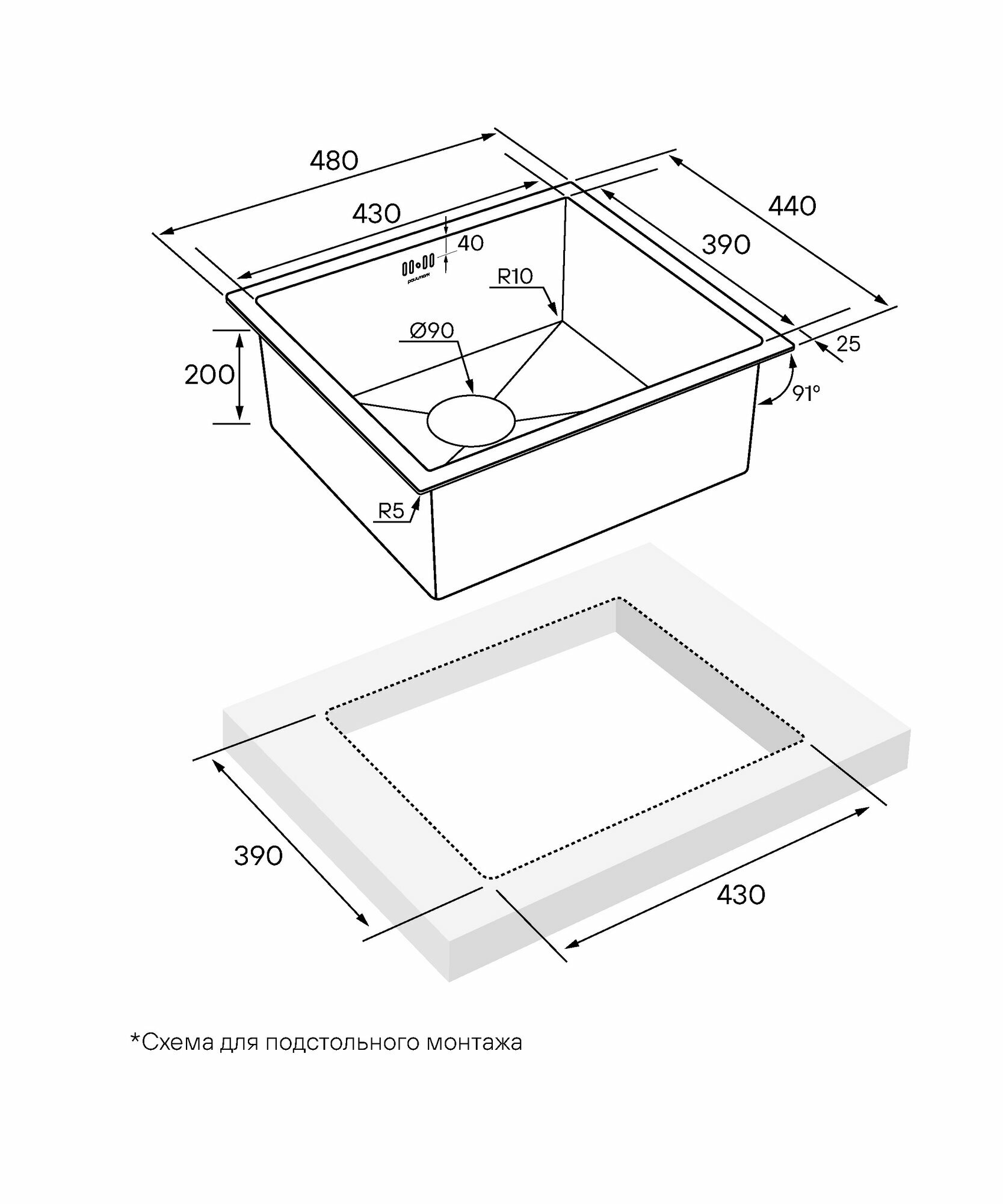 Кухонная мойка из нержавеющей стали Paulmark MARX, 480х440 мм, врезная, подстольная и вровень со столешницей, цвет брашированная сталь, PM214844-BS