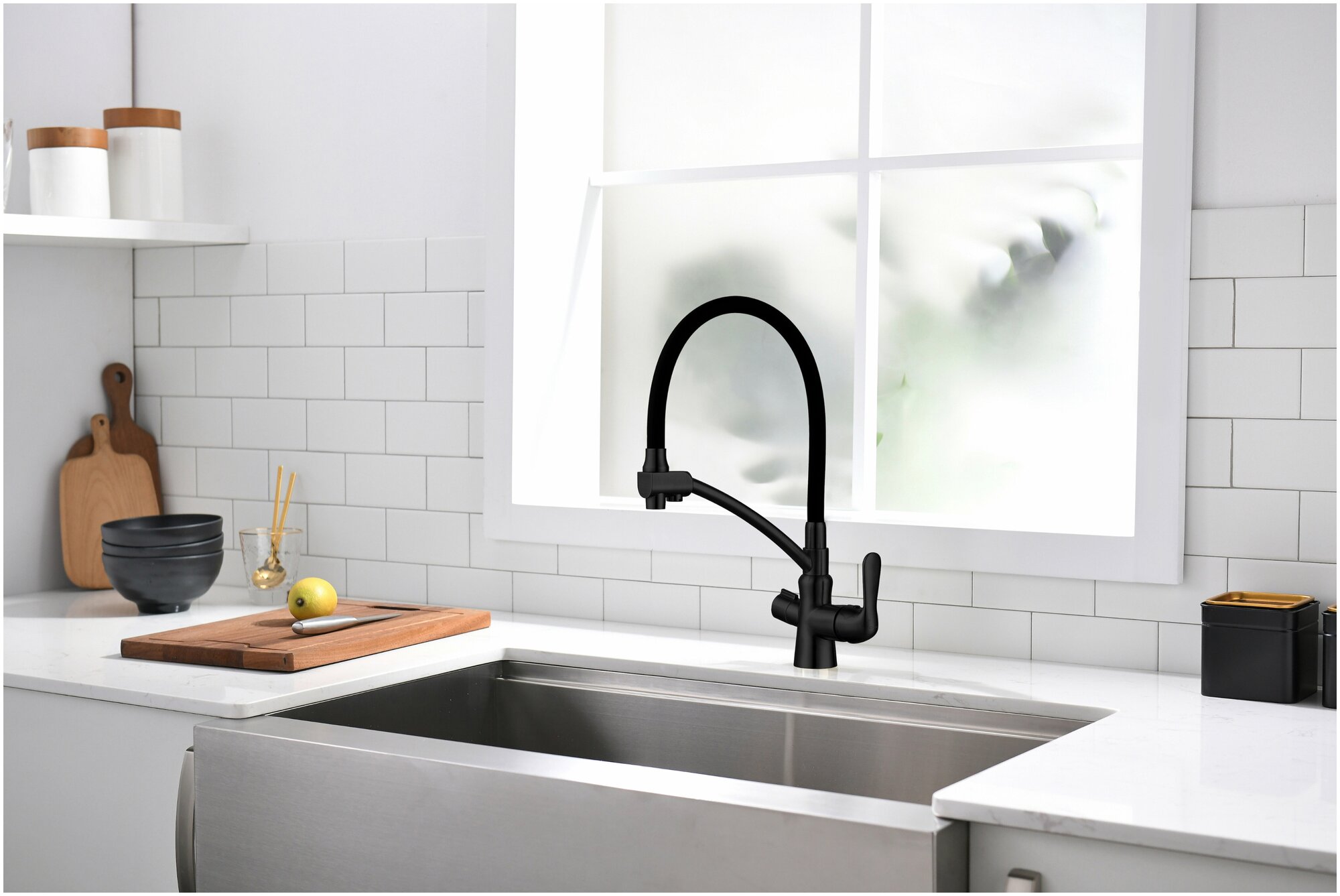 Смеситель для кухни(мойки) с подключением к фильтру питьевой воды 2 в 1 с гибким изливом высокий.Chipponi 210BL однорычажный чёрный. интересное: