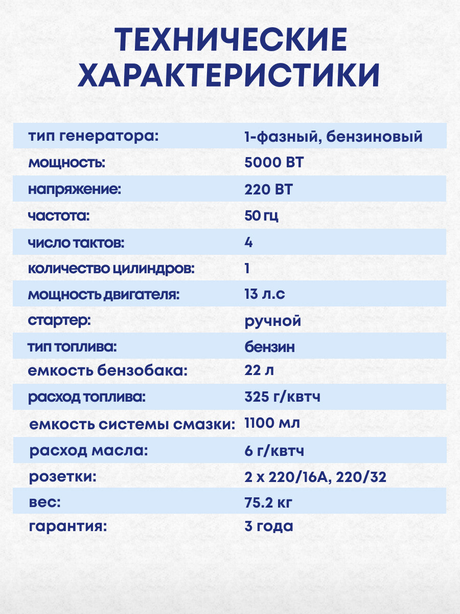 | Дополнительная информация | цифровой дисплей с функцией индикации; антивибрационная система;расход масла 6 г./кВтч; датчик масла; расход топлива при 75% используемой мощности 2,45 л/ч |