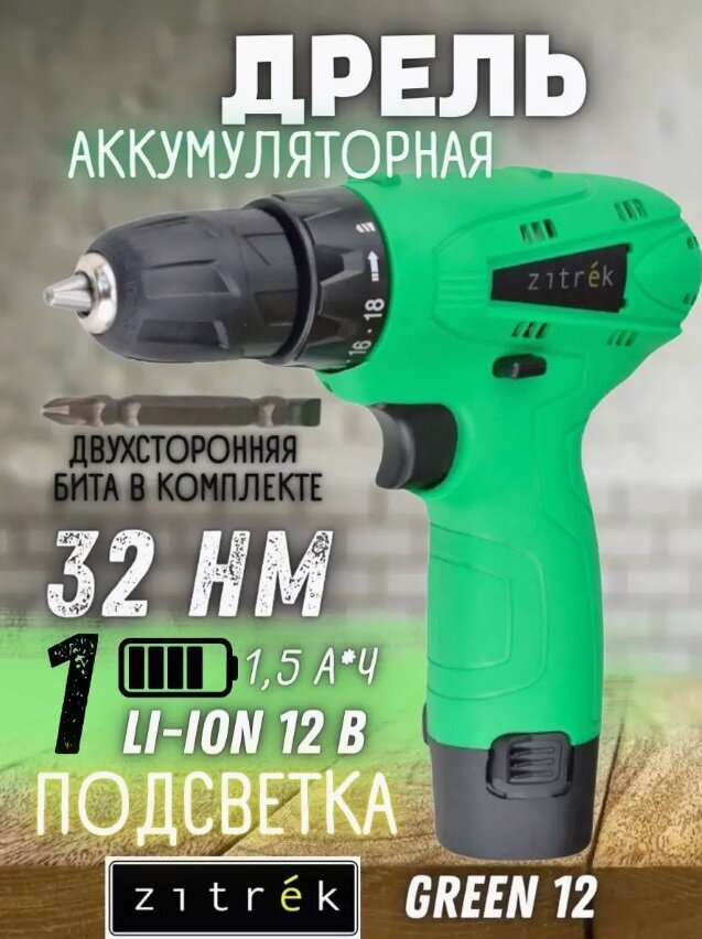 Дрель-шуруповерт аккумуляторная Zitrek Green 12-Li-ion 12В, Li-ion аккумулятор, бита [063-4041] .