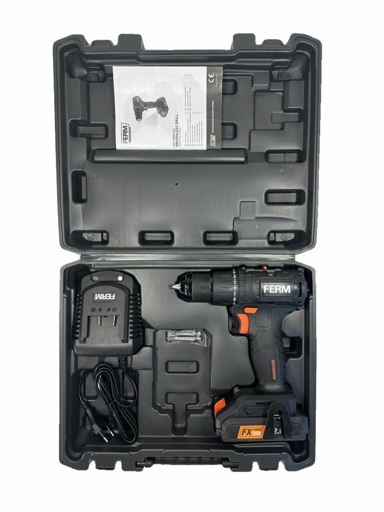 Акк. Дрель-шуруповёрт FERM Б/щетчная, Li-Ion 20 В, 1 аккум. 2.0 Aч,50 Hм, 20В, БЗП, 2 скорости,:LED подсветка, бита, кейс, ЗУ