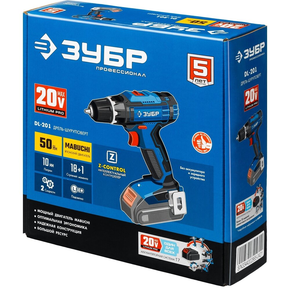 Дрель-шуруповерт "Зубр. DL-201", 20 В, без АКБ, в коробке
