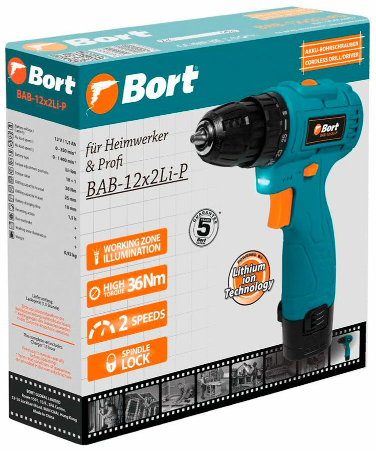 Bort BAB-12x2Li-P (1x1,5 Ah) Дрель-шуруповерт аккумуляторная (93414011) .