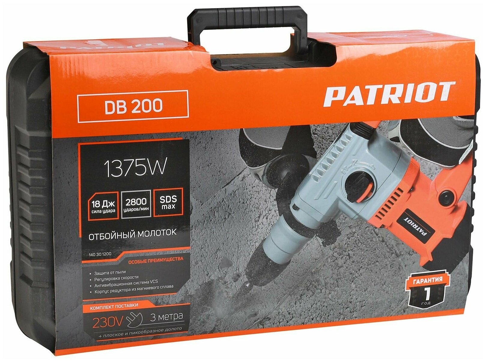 Отбойный молоток Patriot DB 200, мощность 1375 Вт, энергия удара 18 Дж, 2800 уд./мин., 2 зубила, в комплекте кейс