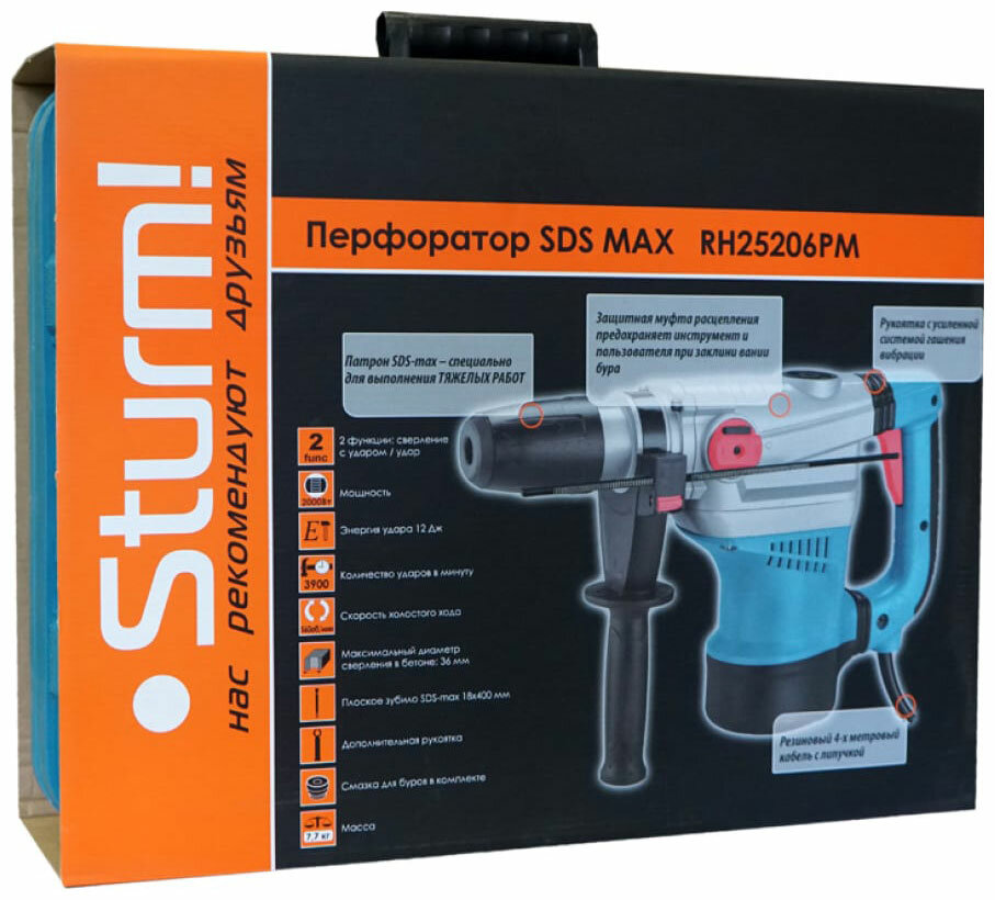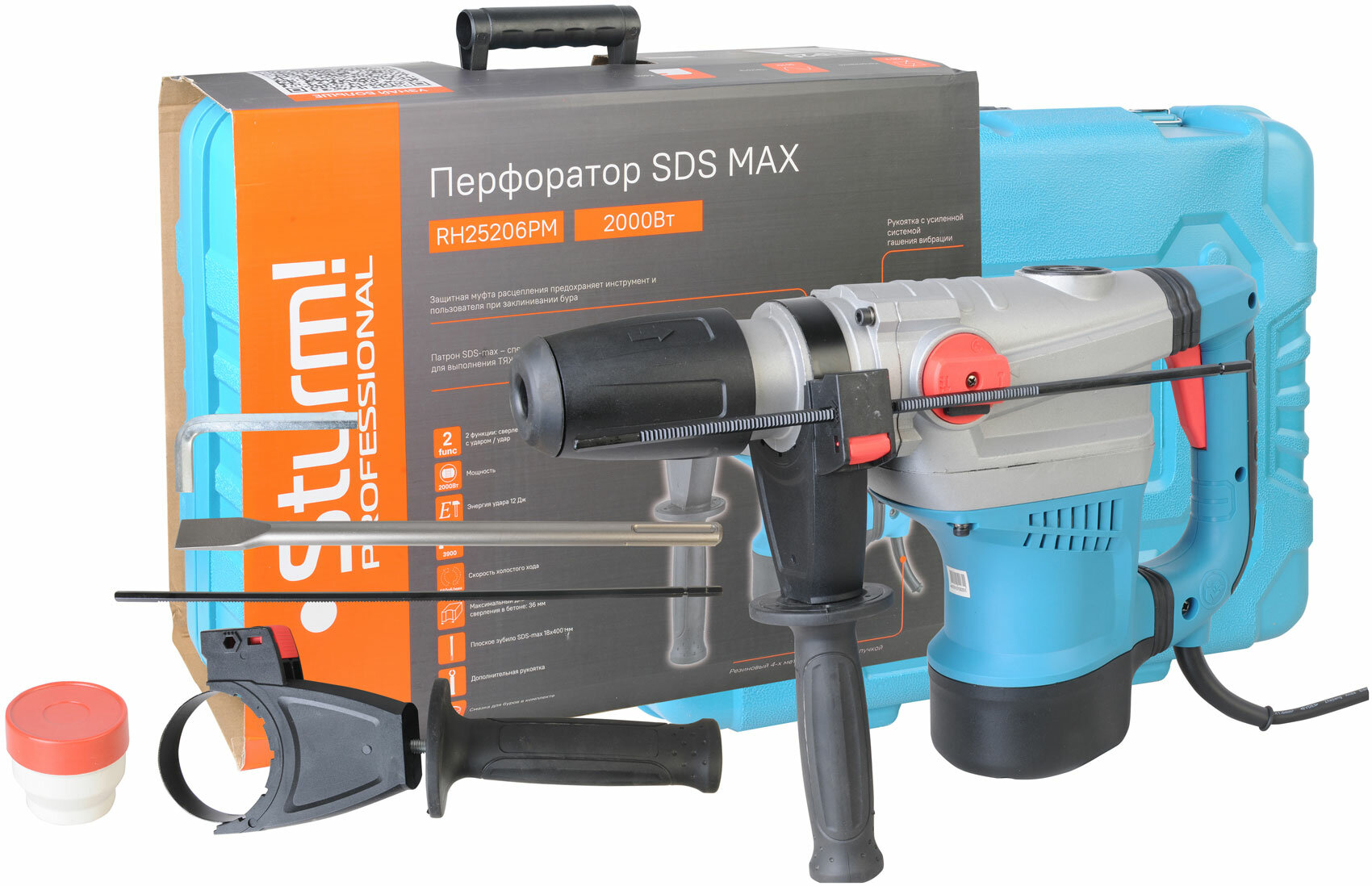 RH25206PM Перфоратор SDS-MAX 2000Вт, 12Дж, 3900уд/мин, 560об/мин, 2 режима, кейс, Sturm!