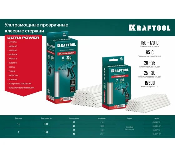 KRAFTOOL 40 шт., 1 кг, 11 x 250 мм (11-12 мм), прозрачные, ультрамощные клеевые стержни 06848-40