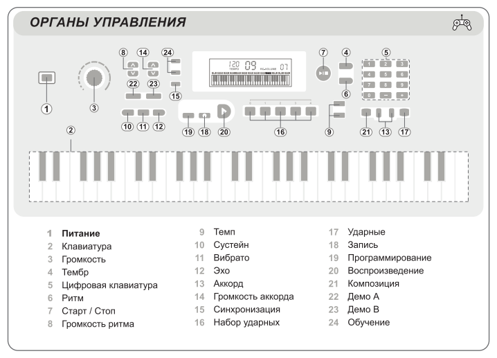 | Комплектация | Синтезатор-1 шт; блок питания -1 шт; инструкция; гарантийный талон. |