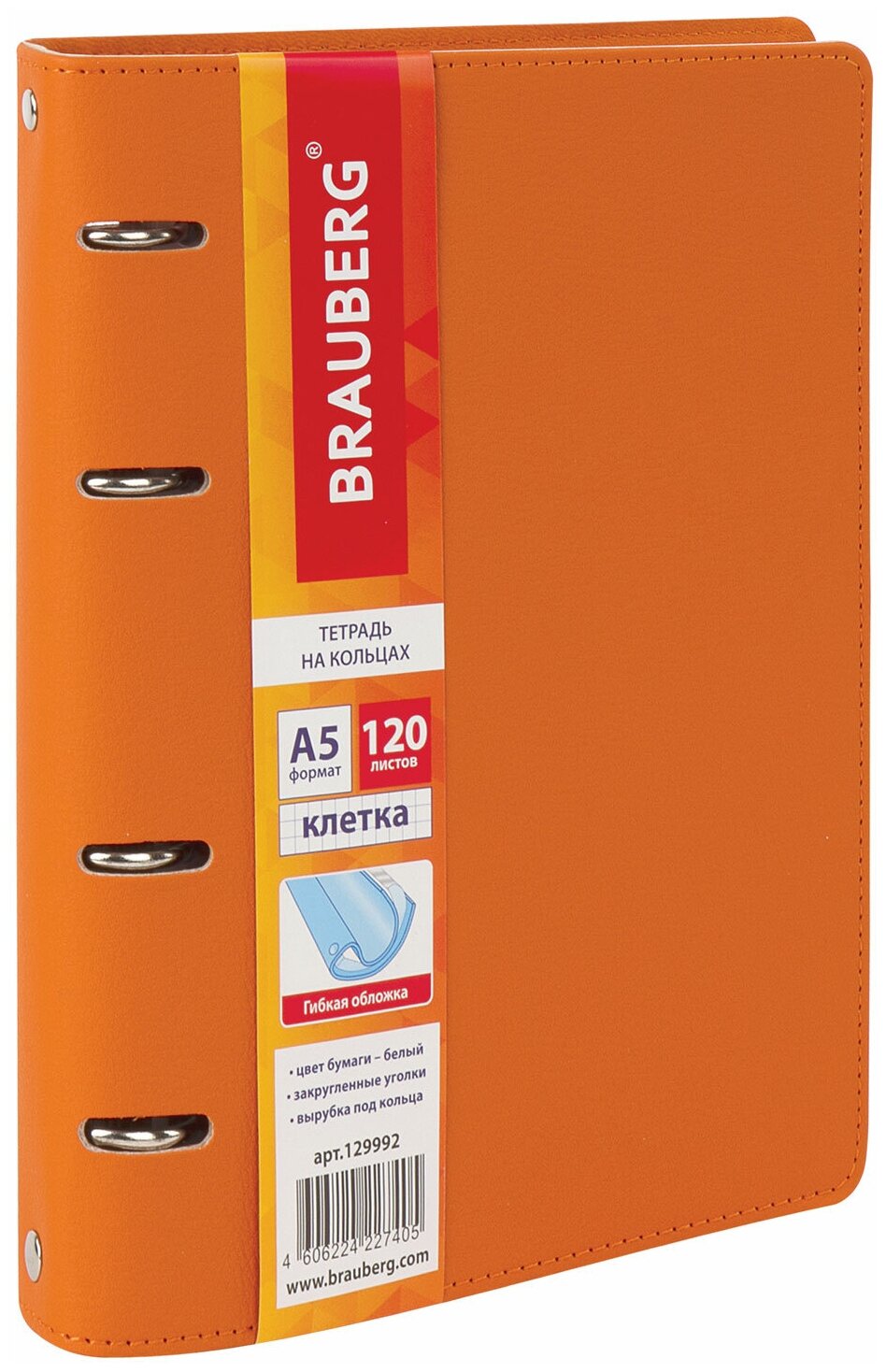 Купить Тетрадь на кольцах А5 (180х220 мм), 120 листов, под кожу, клетка, BRAUBERG "Joy", оранжевый/светло-оранжевый, 129992