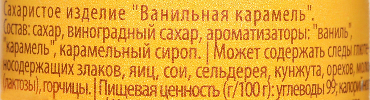| Состав | сахар, виноградный сахар, ароматизаторы: "ваниль","карамель", карамельный сироп |
