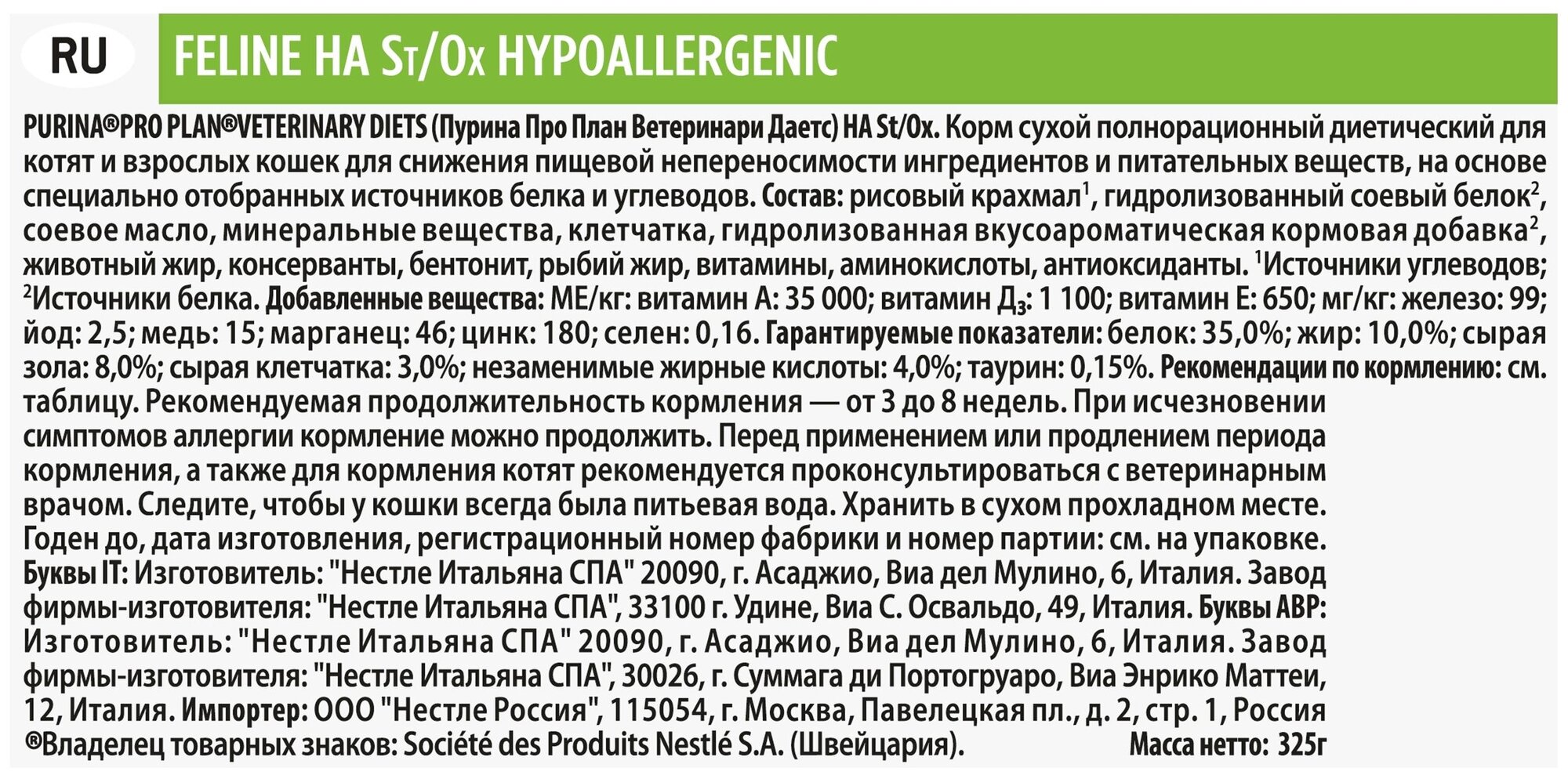 PURINA VETERINARY DIETS HA ST/OX HYPOALLERGENIC для кошек и котят при аллергии (0,325 кг)