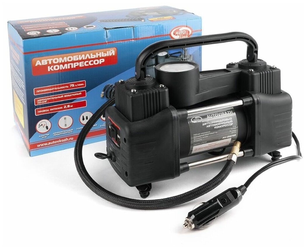 Компрессор автомобильный, двухцилиндровый Autovirazh 75 л/мин с манометром AV-010750 5218368