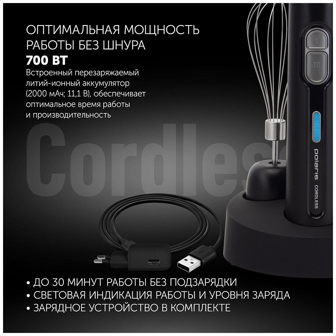 Погружной блендер Polaris PHB 0746 CordLess, 2 скорости, 700 Вт, черный