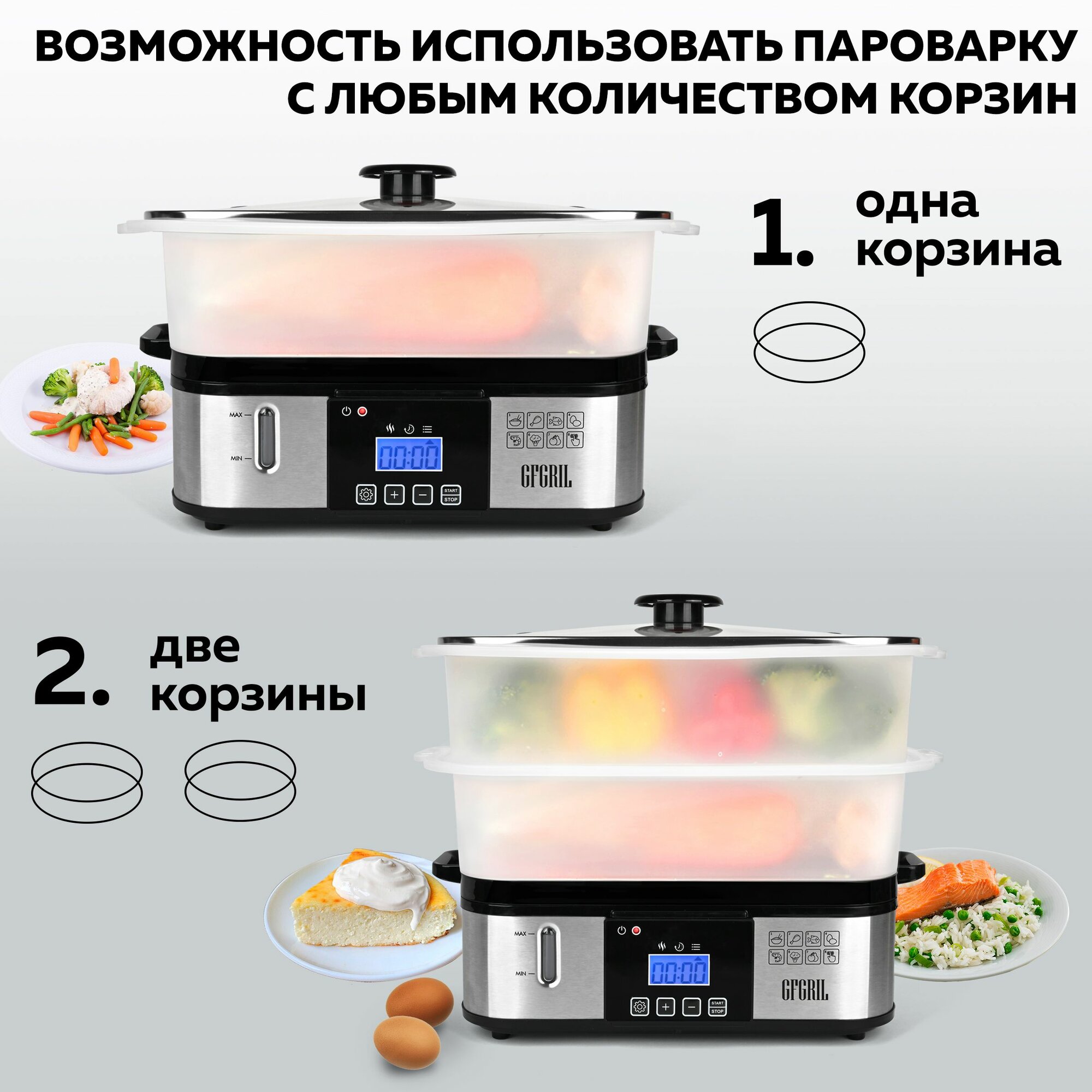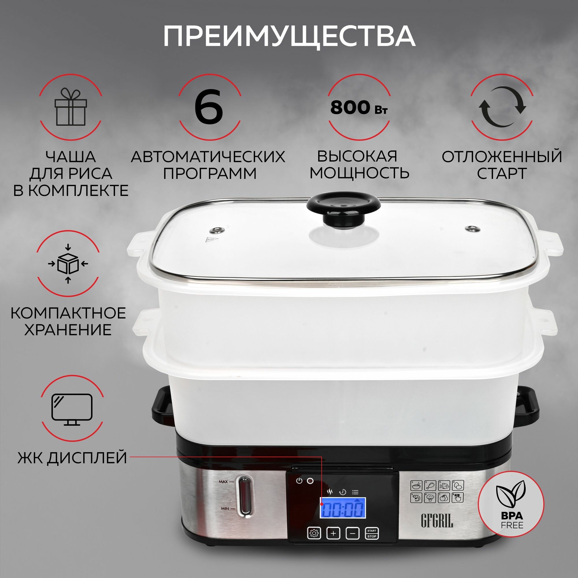GFGRIL пароварка GFS-9D, 8 программ, цифровое управление, ударопрочные чаши, электрическая пароварка объемом 12л, формы для омлета и маффинов