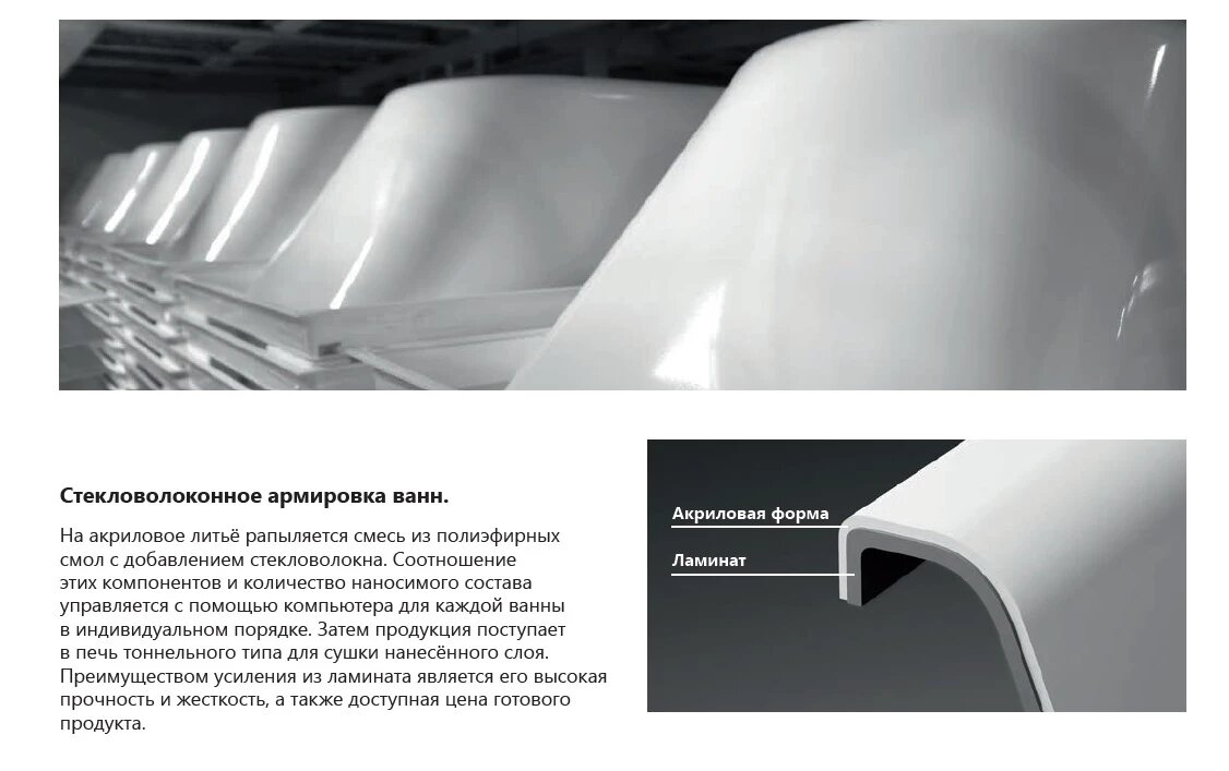 | Дополнительная информация | опции: шторка для ванны, фронтальная панель; литьевой акрил Lucite вертикального выдува; равномерная толщина материала по всей площади ванны; армирование стекловолокном |