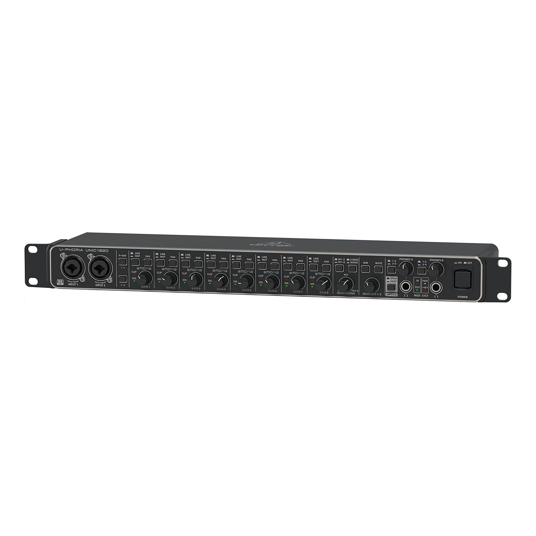 Behringer UMC1820 внешний звуковой/MIDI интерфейс, USB 2.0 ,18 вх/20 вых канала, 24бит/96кГц, предусилители MIDAS, MIDI I/O, ADAT I/O, S/PDIF I/O