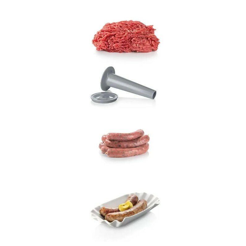 | Плюсы: | В комплекте 3 решетки разного диаметра, насадка для колбасок, кеббе. |