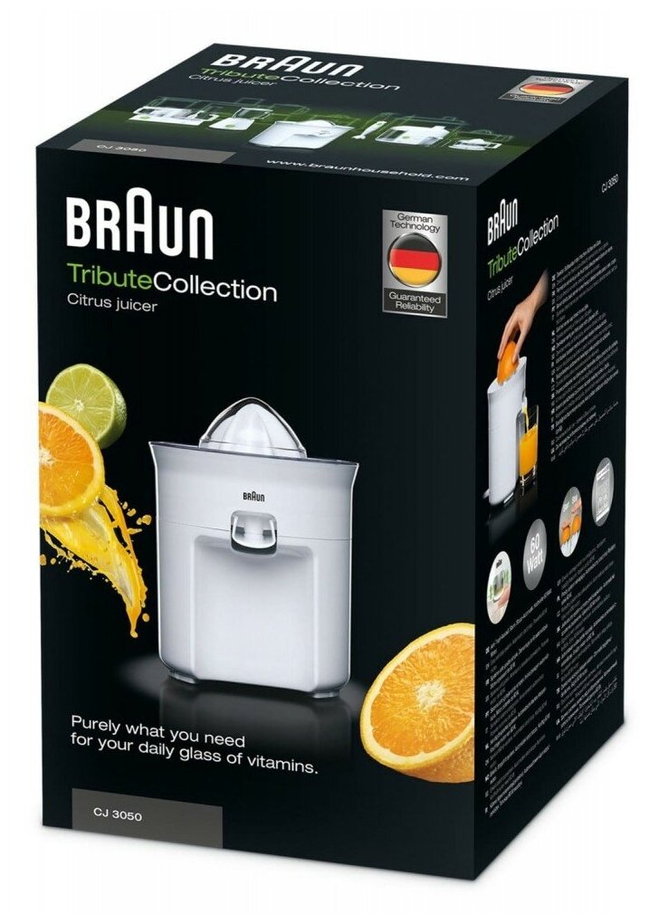 Соковыжималка для цитрусовых Braun CJ-3050 (Мощность 60 Вт. Система прямой подачи сока. Система "капля-стоп". Материал корпуса пластик. Импульсный режим.)