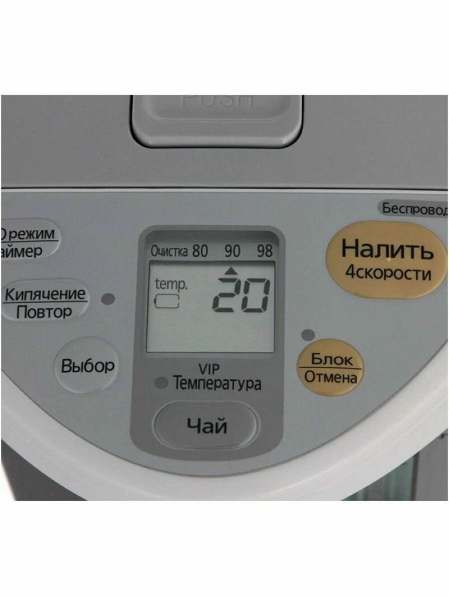 | Плюсы: | 1. Качественный термопот, выглядит красиво. <br>2. Главный плюс, что вода остаётся всегда горячей, можно выставить 80, 90 или 98 градусов, и вода в термопоте будет постоянно держаться этой температуры. <br>3. Когда доливаешь в него воду, ничего не надо нажимать для нагрева, термопот сам определяет, что температура воды ниже нормы и автоматически нагревается. Если вижу, что остаётся меньше 1 литра, то доливаю воды, чтобы потом, когда понадобится, не приходилось ждать, пока он закипит, к тому же ещё у него есть одна особенность (смотреть пункт 2 в разделе недостатки). <br>4. Очень хорошо видно, сколько в термопоте осталось воды, за счёт красного шарика в уровне. <br>5. Довольно тихо закипает. Раньше с обычным чайником, когда он закипал, становилось не слышно телевизор, тут этот недостаток отсутствует. <br>6. После закипания термпопот подаёт ненавязчивый, но слышимый сигнал. <br>7. Различные функции такие, как таймер, или функция Energy saving - термопот запоминает, когда им пользуются, и отключает поддержание температуры, например, ночью, для экономии энергии. |