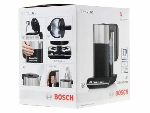 Bosch TWK8613P Чайник, 2400Вт, черно-серебристый, терморегулятор