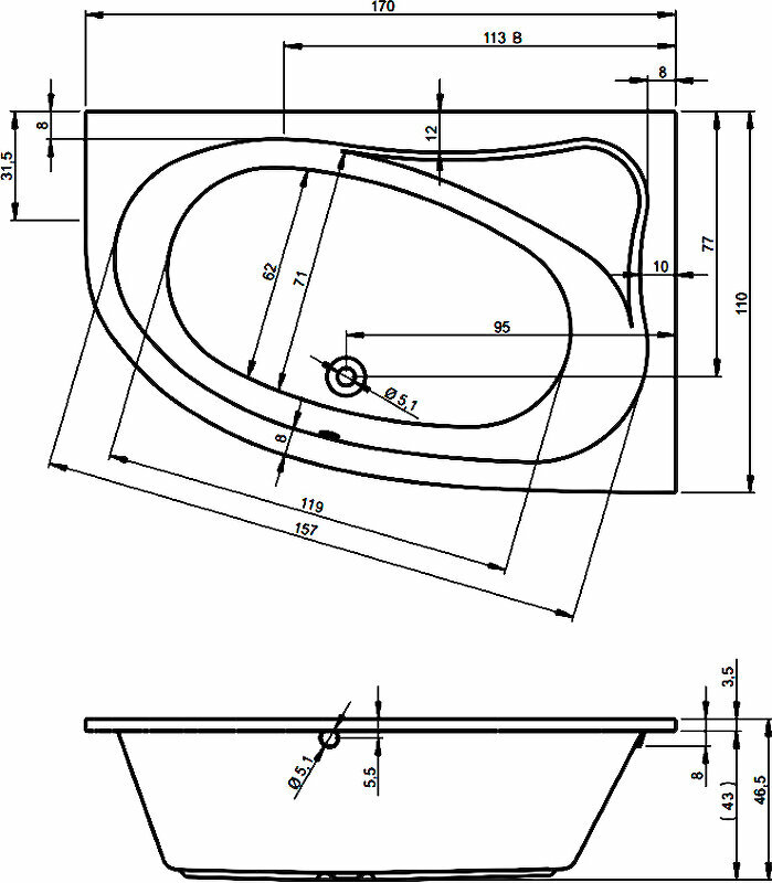 Ванна акриловая RIHO LYRA R B017001005 (правая) 170 x 110 см белая