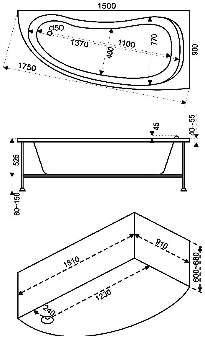Ванна алегра (левая) (ванна+каркас) 1500*900