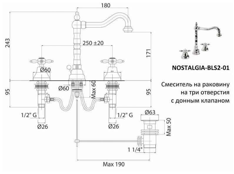 Смеситель для раковины Cezares Nostalgia на 3 отверстия, с донным клапаном (Nostalgia-BLS2-02)