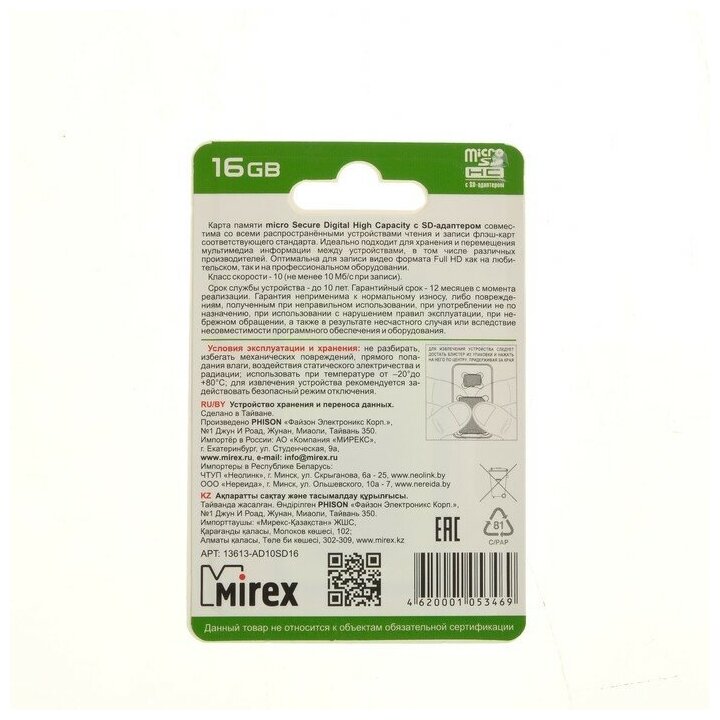 Mirex <13613-ad10sd16> microSDHC 16Gb Class10 + microSD-->SD Adapter .