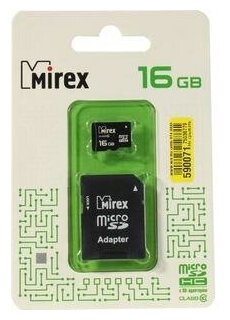 Карта памяти Mirex microSDHC 16 ГБ Class 10, R/W 25/10 МБ/с, адаптер на SD, 1 шт., черный